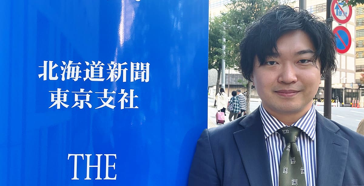 東京支社営業局で新聞広告、WEB広告などの広告営業業務を担当しています。広告セールスだけではなく、セミナーやイベントの立案も行っており、北海道へも頻繁に出張します。東京支社は、世界を相手取っているナショナルクライアントに対して、北海道新聞という媒体の価値をいかに示すことができるのかを試される非常にやりがいのある職場です。北海道新聞だけではなく、全国の地方新聞社が東京に支社を持っており、地方新聞社同士で連携してクライアントに提案することもあります。新聞業界は同業種の競合が少ない珍しい業界なので、地方新聞社同士の横のつながりを持てるいい環境だと思っています。