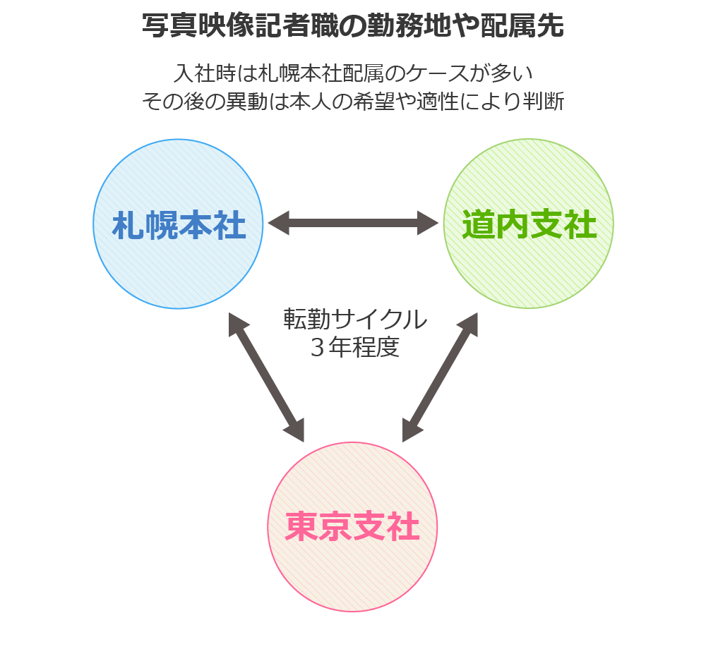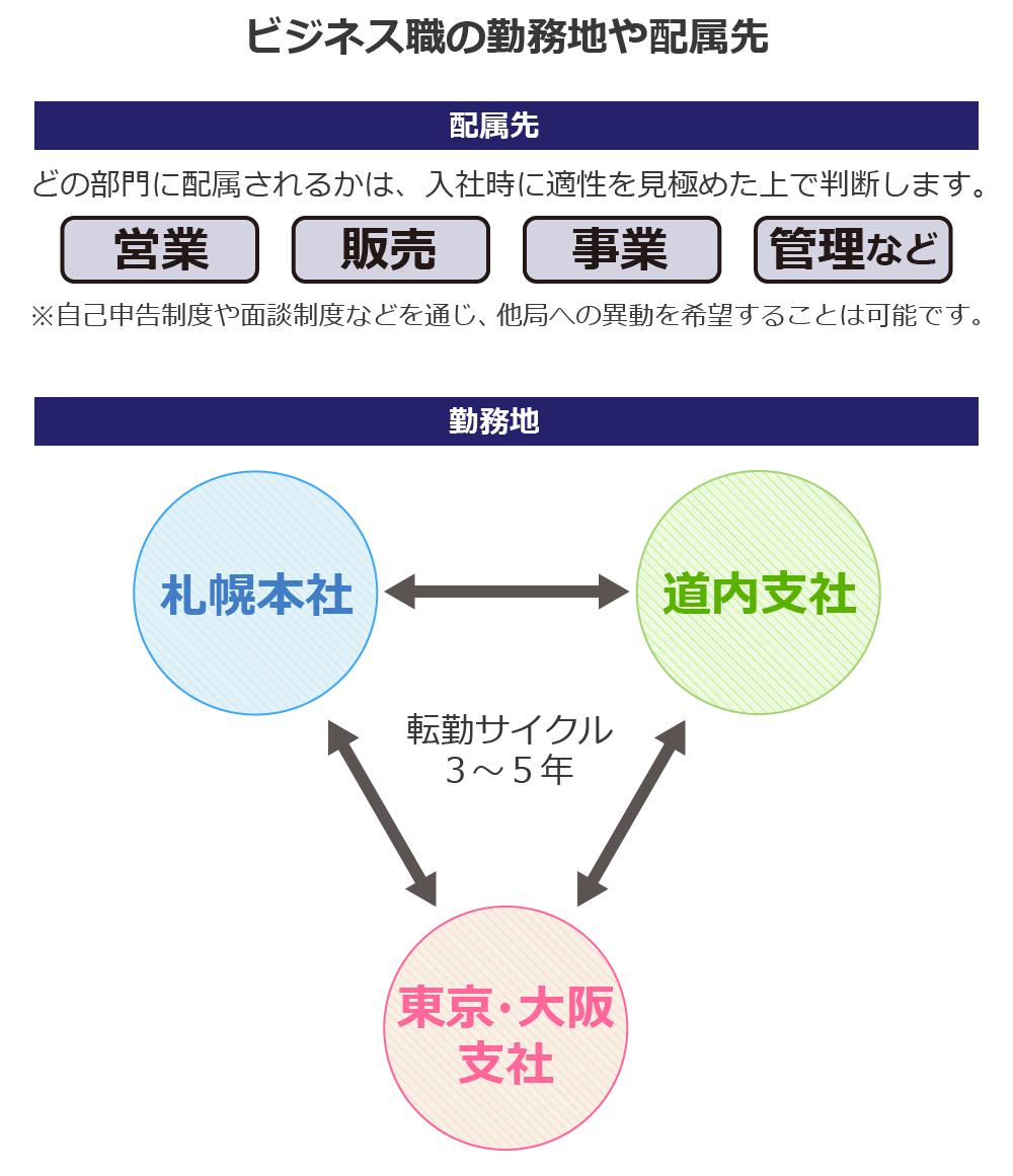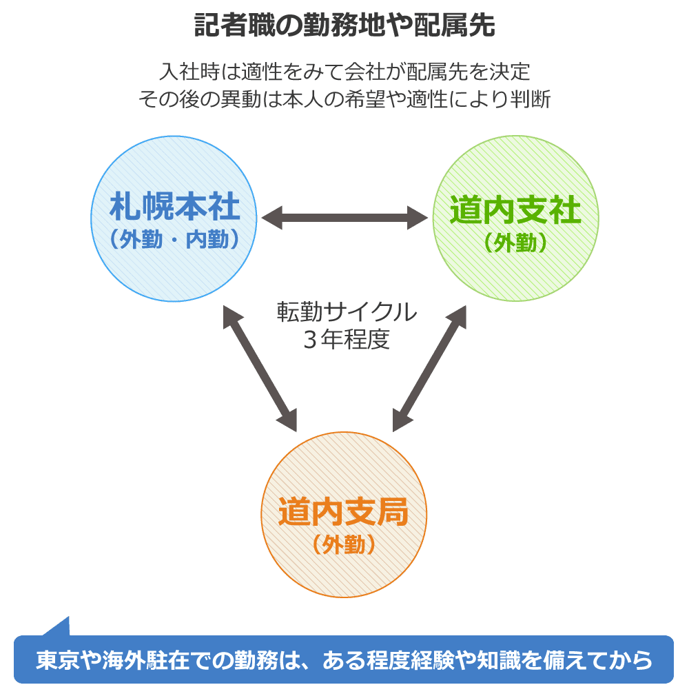 北海道新聞社では職種別採用を行っているため、基本的には他職種への異動(例:記者職からビジネス職など)はできません。ただしビジネス職は、局間異動(例:営業局から販売局、事業局から営業局など)が可能です。1つの職種で複数の局を経験できる幅広さが特徴です。
